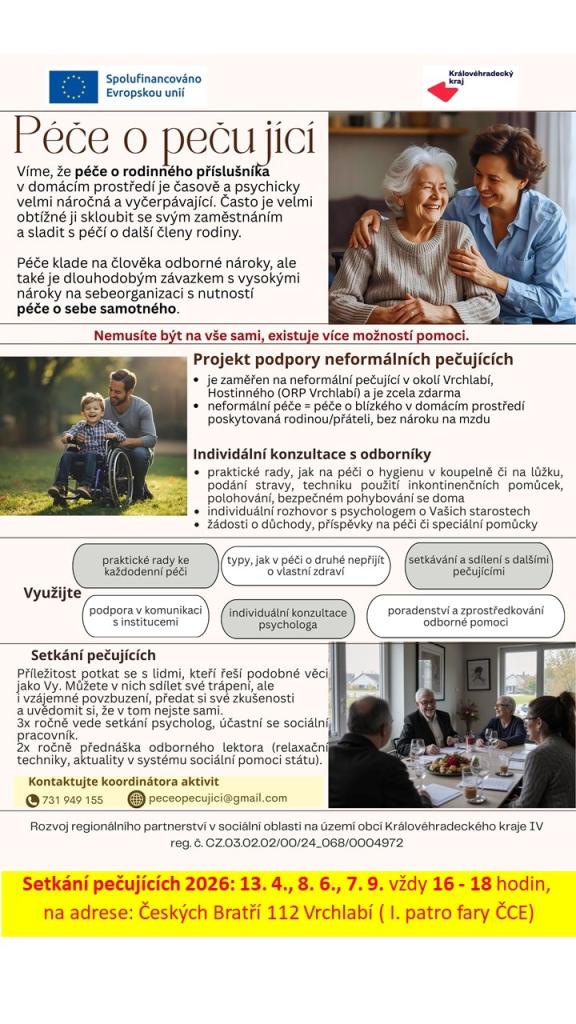 Ve Vrchlabí je k dispozici bezplatná podpora pro neformální pečující, včetně odborných konzultací a sdílení zkušeností. Setkání pečujících proběhnou v termínech: 13. 4., 8. 6. a 7. 9., vždy od 16 do 18 hodin na adrese Českých bratří 112 (fara ČCE). Více informací naleznete v přiloženém letáku